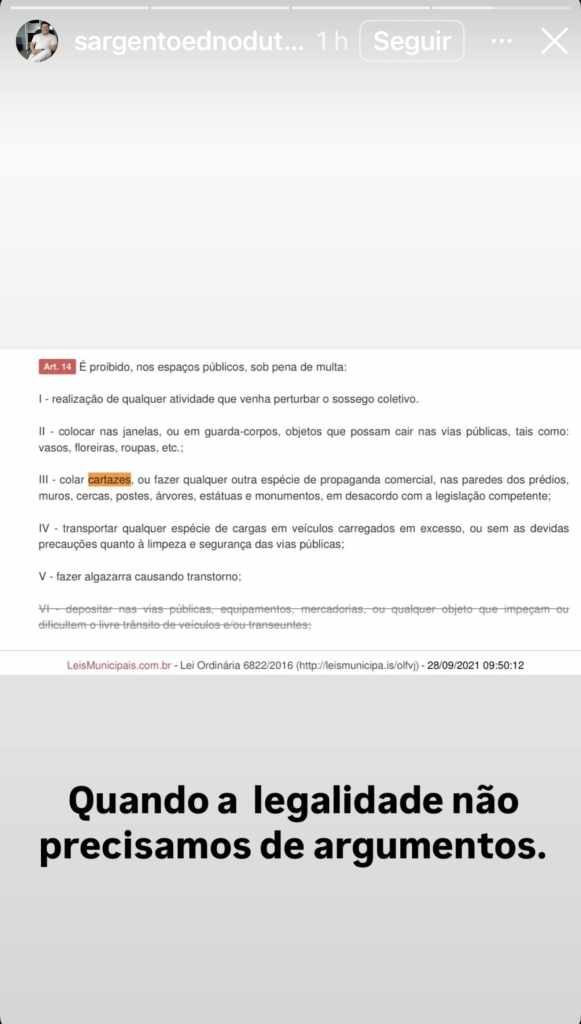 Acredito que o superintendente sequer leu com atenção o artigo citado por ele para justificar a conduta, registra-se, criminosa, do agente que retirou as faixas. O artigo 14 da Lei Municipal citado pelo senhor Edno trata-se, exclusivamente, de bens públicos. O local onde estavam postas as faixas trata-se de um ambiente privado, e, de maneira alguma, o município, ou representante dele, pode ir lá fazer o que foi feito. Tanto é que, se fosse, como dito, uma conduta legal, o agente que retirou as faixas não precisaria esconder o rosto, falou o advogado.
